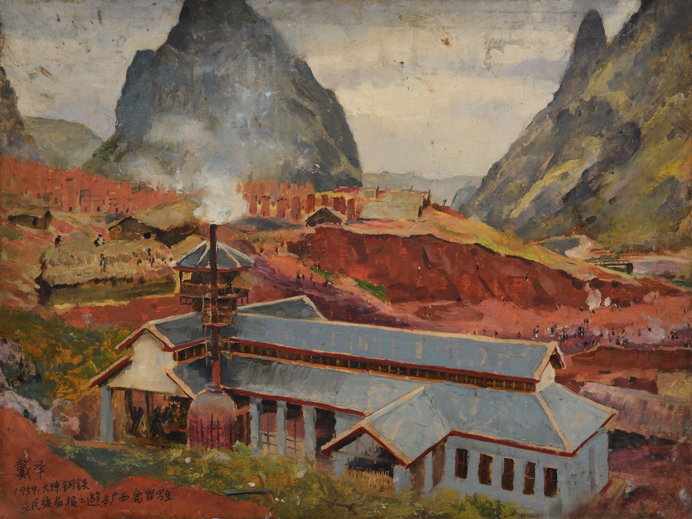 portant; letter-spacing: 0px; background-color: rgb(255,255,255); text-indent: 0px; -webkit-text-stroke-width: 0px; font-variant-ligatures: normal; font-variant-caps: normal; text-decoration-style: initial; text-decoration-color: initial">鹿寨英山钢铁厂 戴泽 1959年 木板油画 收