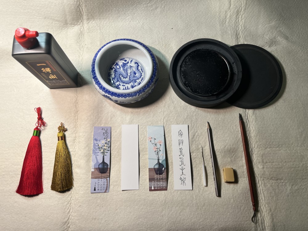 所需工具:书签、铅笔、橡皮、毛笔、墨汁、锥子、装饰物等。