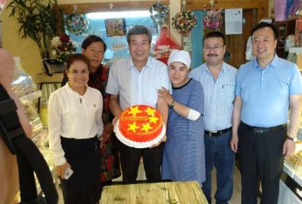 虽然汉语不熟练,佐日古丽的蛋糕少写了几个字,但她真诚地说:“感谢党和政府!!!56个民族像石榴籽那样紧紧抱在一起,维护好民族团结!!!”