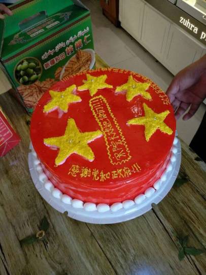2017年7月6日,新疆和田地区墨玉县芒来乡其尼巴格村村民佐日古丽•阿布杜克热木为一名远道而来的医生制作了一个“团结”版蛋糕。
